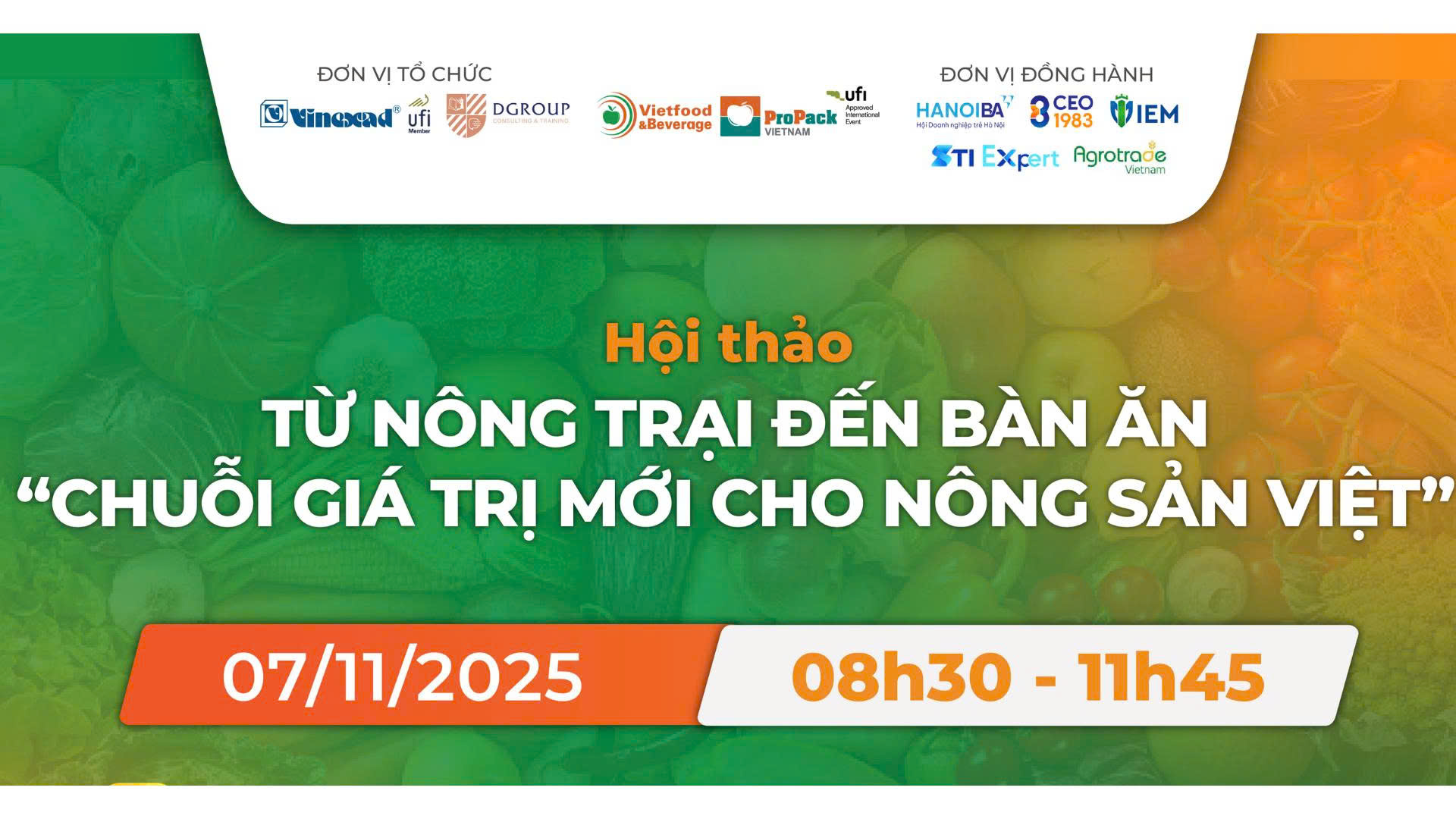 Ban tổ chức xin trân trọng thông báo và kính mời Anh/Chị cùng tham gia chương trình HỘI THẢO: "TỪ NÔNG TRẠI ĐẾN BÀN ĂN - CHUỖI GIÁ TRỊ MỚI CHO NÔNG SẢN VIỆT" được tổ chức bởi DGroup, Vinexad phối hợp cùng Câu Lạc Bộ CEO 1983, STI Expert, Viện Doanh Trí - IEM và Agrotrade Việt Nam.