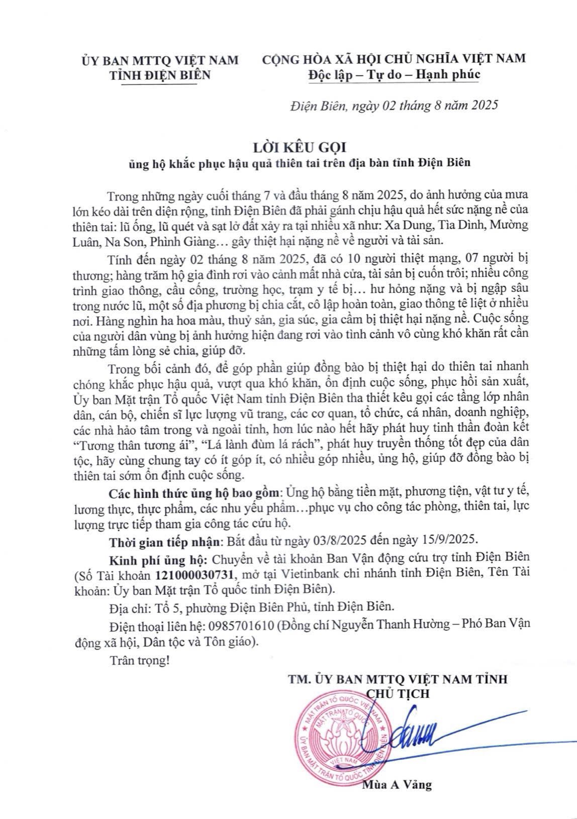 THÔNG BÁO KÊU GỌI ỦNG HỘ ĐỒNG BÀO BỊ THIỆT HẠI DO MƯA LŨ TẠI TỈNH ĐIỆN BIÊN